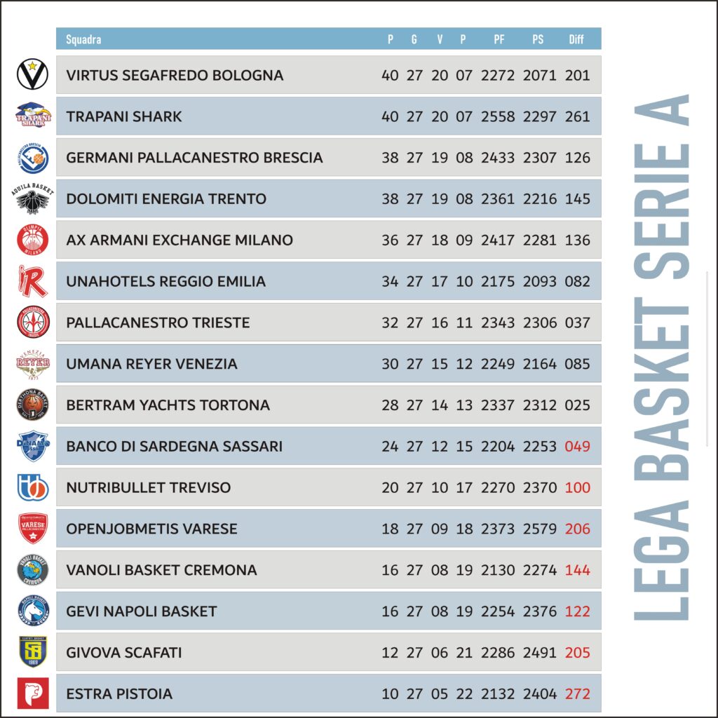 Grazie alle rispettive vittorie, Trapani e Virtus Bologna mantengono due punti di vantaggio su un’altra coppia, quella composta dalla Germani Brescia e dalla Dolomiti Energia Trento, entrambe a bersaglio. Ai lombardi basta un filo di gas per liberarsi della Givova Scafati, squadra sempre più in crisi ed ormai ad un passo dal mesto ritorno in A2. Alla Germani bastano i primi 20’ per sbrigare la pratica campana e tornare così al successo dopo lo stop della settimana scorsa. La compagine di Poeta, infatti, chiude il primo tempo sul 49-31, per poi chiudere in scioltezza con 14 lunghezze di vantaggio. Nei bresciani, 16 a testa di Bilan, con 7/10 da due e 10 rimbalzi, e Della Valle (5/11), per Scafati 15 di Cinciariani (5/14) e 14 di Zanelli.