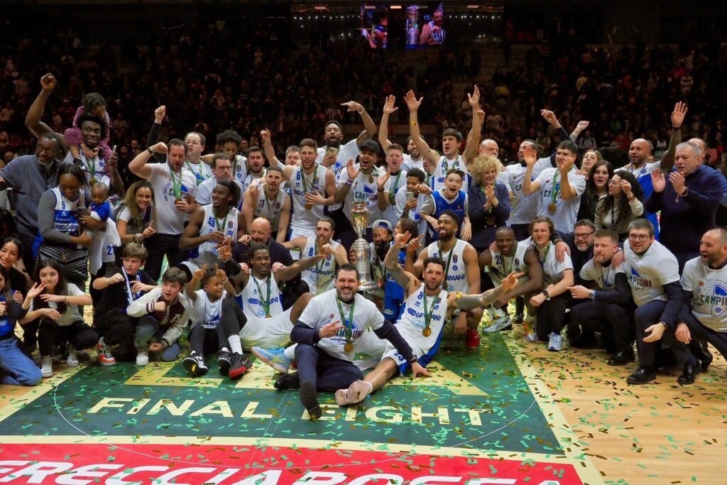 Trascinati da uno straordinario Amedeo Della Valle autore di una prova sontuosa e premiato come MVP (5/7 da 2, 2/7 da 3, 10/10 ai liberi, 6 assist, 3 rimbalzi e 6 falli subiti) la Germani Brescia conquista la prima Coppa Italia della sua storia: dopo aver eliminato Milano ai quarti e Pesaro in semifinale, ha battuto in finale la Virtus Bologna di un grande Marco Belinelli.